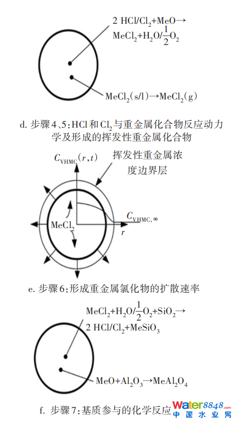 圖2顯示了揮發(fā)性重金屬化合物在整個(gè)揮發(fā)過(guò)程中可能存在的限制步驟。每種重金屬的限制步驟不盡相同,其中,步驟6與步驟7相互競(jìng)爭(zhēng),重金屬氯化物可能在反應(yīng)后開(kāi)始揮發(fā),也可能與反應(yīng)體系內(nèi)的基質(zhì)進(jìn)行二次反應(yīng)。