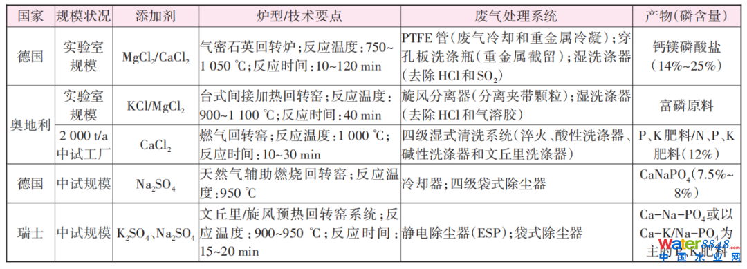 AshDec工藝雖然被認(rèn)為是磷肥生產(chǎn)工藝而非廢物處理工藝,但其仍然遵守各國(guó)廢物焚燒指令與相應(yīng)各國(guó)法律所規(guī)定的廢氣排放標(biāo)準(zhǔn)。表1總結(jié)了采用AshDec工藝小/中試應(yīng)用案例及相應(yīng)廢氣處理系統(tǒng)。
