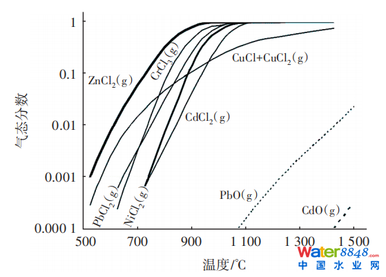 灰分中的重金屬大致可分為非揮發(fā)性(Cr、Ni)、低揮發(fā)性(Cu、Zn)及高揮發(fā)性(Cd、Pb)。有人通過(guò)熱力學(xué)平衡計(jì)算發(fā)現(xiàn),高揮發(fā)性元素(Cd、Pb)去除無(wú)需氯化,它們以氫氧化物和/或氧化物形式揮發(fā);而對(duì)低揮發(fā)性及非揮發(fā)性元素,則需要向灰分中添加大量Cl(質(zhì)量分?jǐn)?shù)至少10%)才能使其以氯化物形式揮發(fā)。
