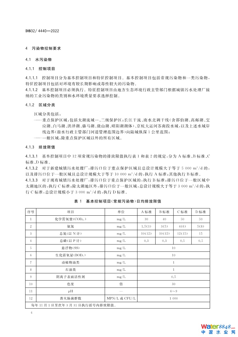 《DB32/ 4440-2022城鎮(zhèn)污水處理廠污染物排放標(biāo)準(zhǔn)》中排放A標(biāo)準(zhǔn)的多個常規(guī)指標(biāo)除TN外都達(dá)到了Ⅳ類水標(biāo)準(zhǔn),COD:30mg/L,氨氮:1.5mg/L,TP:0.3mg/L,TN:10mg/L,排放指標(biāo)達(dá)到了準(zhǔn)Ⅳ類水標(biāo)準(zhǔn)(注:“準(zhǔn)Ⅳ類”標(biāo)準(zhǔn)指的是污水中常規(guī)指標(biāo)除總氮外均達(dá)到地表水Ⅳ類標(biāo)準(zhǔn)),標(biāo)準(zhǔn)要求對于新建城鎮(zhèn)污水處理廠,排污口位于重點(diǎn)保護(hù)區(qū)域且總設(shè)計(jì)規(guī)模大于等于5000 m3/d的,以及排污口位于一般區(qū)域且總設(shè)計(jì)規(guī)模大于等于10000 m3/d的,執(zhí)行A標(biāo)準(zhǔn)。