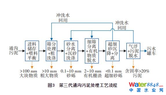 ② 不同城市通溝污泥的性質差別很大,同時污泥性質還受到管網(wǎng)類型與用地類型的影響。濕式多級分離處理工藝對通溝污泥性質變化適應性強,還可兼顧污泥的資源化利用。鑒于“節(jié)水即治污”的理念,堅持節(jié)水優(yōu)先的政策,對于水資源敏感地區(qū),可采用沖洗水全回用的通溝污泥處理工藝。該工藝可實現(xiàn)約100%沖洗水回用,有利于大幅降低尾水排放量,提高通溝污泥資源化利用率。該工藝可采用移動式通溝污泥處理站形式,解決通溝污泥處理點分散的問題。
