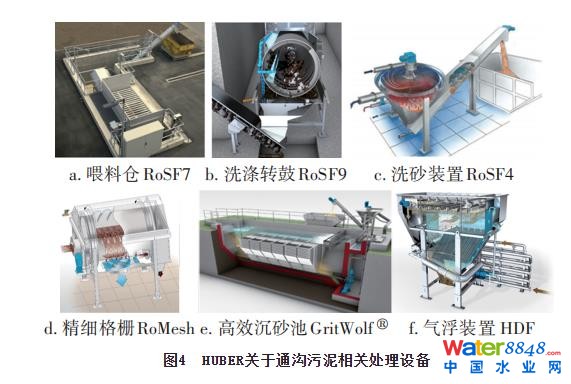 對于移動式通溝污泥處理站,需要統(tǒng)籌考慮其沖洗水來源、尾水排放、篩分物處理、占地等因素。針對上述考慮,HUBER推出一種緊湊式的沖洗水全回用的通溝污泥處理工藝,即第三代通溝污泥處理工藝,其流程見圖3,相關設備見圖4。