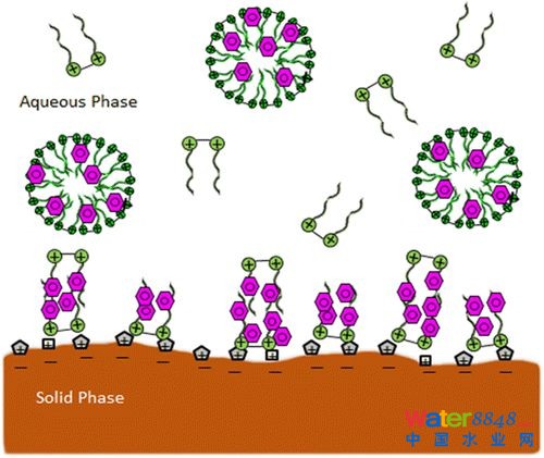 摘要:選用三種具有不同碳鏈的對(duì)稱及不對(duì)稱結(jié)構(gòu)雙子表面活性劑(C 12-2-16、C 12-2-12、C 12-2-8),以一種多環(huán)芳烴為目標(biāo)物,研究雙子表面活性劑不同構(gòu)效關(guān)系對(duì)多環(huán)芳烴在水-顆粒界面吸附、解吸、分布、遷移的影響。研究發(fā)現(xiàn)對(duì)于吸附了雙子表面活性劑的土壤顆粒,對(duì)于萘的吸附行為遵循C 12-2-16 < C 12-2-12 < C 12-2-8。但是綜合兩個(gè)方面考慮(高的滯留性能和較低的投放量),最佳的吸附介質(zhì)是C 12-2-12。對(duì)于小于表面活性劑臨界膠束濃度(CMC)和大于CMC時(shí),多環(huán)芳烴在水-土壤顆粒表面分布及遷移是兩種截然不同的狀態(tài),可以分為幾個(gè)步驟:當(dāng)小于CMC時(shí),陽離子雙子表面活性劑的帶電荷部分與土壤帶負(fù)電荷的顆粒相結(jié)合,形成一層界面,而疏水基部分還可以與其他表面活性劑的疏水基鏈接,形成第二層界面。而在界面之間,則有少量的疏水性多環(huán)芳烴與疏水基鏈相結(jié)合。隨著雙子表面活性劑的繼續(xù)加入,大于CMC時(shí),多余的雙子表面活性劑則在溶液中形成膠束,可以溶解大量的多環(huán)芳烴,還能將固體顆粒界面上吸附的多環(huán)芳烴解吸于膠束中。
