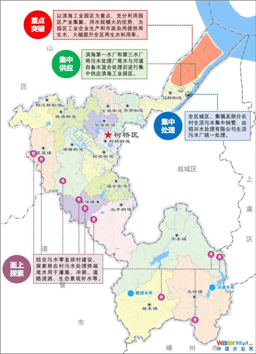 作為全省工業(yè)用水量最大的縣級(jí)行政區(qū),柯橋區(qū)工業(yè)用水已占到全區(qū)用水總量的50%以上。一面是占全區(qū)規(guī)上企業(yè)產(chǎn)值的一半以上的高耗水紡織業(yè),一面是經(jīng)濟(jì)社會(huì)發(fā)展對(duì)區(qū)域水資源保障提出了更高的要求,推進(jìn)再生水利用成為柯橋區(qū)優(yōu)化供水結(jié)構(gòu)、緩解供需矛盾的關(guān)鍵抓手。為此,柯橋區(qū)以打造“高耗水產(chǎn)業(yè)集聚區(qū)再生水利用配置樣板”為目標(biāo),提出“集中處理,集中供應(yīng),重點(diǎn)突破,面上探索”的再生水利用配置布局,到2025年,全區(qū)萬(wàn)元GDP用水量、萬(wàn)元工業(yè)增加值用水量分別較2020年降低18.0%和22.0%,再生水利用率達(dá)到28%以上,其中工業(yè)再生水利用量4500萬(wàn)立方米以上。