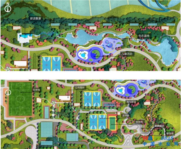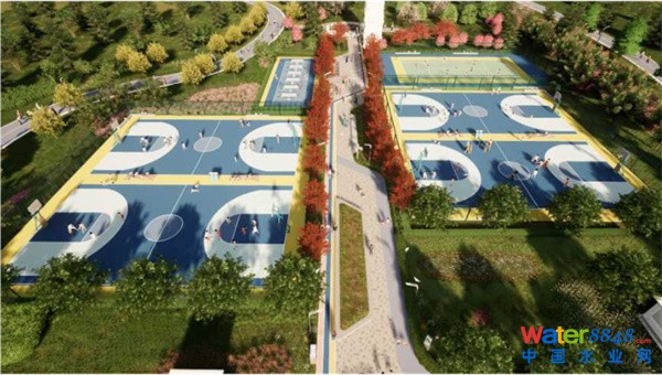 一期工程包含四大功能分區(qū):水光云涌—中軸景觀區(qū),悅水樂動—動感運動區(qū),源清流潔—環(huán)?破諈^(qū),水云清澗—綜合辦公區(qū)。場地內(nèi)設置1100m環(huán)形運動跑道,設置12個運動場地(1個籠式足球場、4個全籃球場、1個網(wǎng)球場、6個乒乓球場),1個綜合運動器械場,1處兒童樂園等。