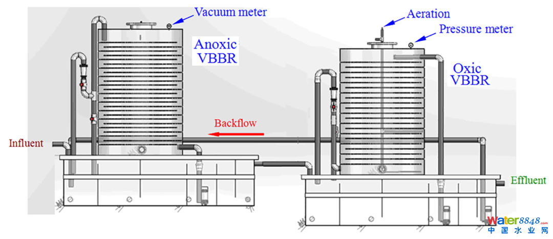 本新工藝則利用VBBR能很好地固定住微生物的特性,將缺(厭)氧與好氧VBBR串聯(lián)在一起,形成一套新穎的反應(yīng)器系統(tǒng)(如圖1所示)。該系統(tǒng)有效地克服了傳統(tǒng)A/O工藝的缺點(diǎn),在循環(huán)過(guò)程中污泥固定不動(dòng)而只有水的循環(huán)流動(dòng),從而大大提高了硝化和反硝化反應(yīng)的效率。此外,由于前段的缺(厭)氧反應(yīng)器(An-VBBR)可以嚴(yán)格限制溶解氧的侵入,從而可以極大地提高有機(jī)碳源的利用率,進(jìn)而實(shí)現(xiàn)“極限脫氮”。