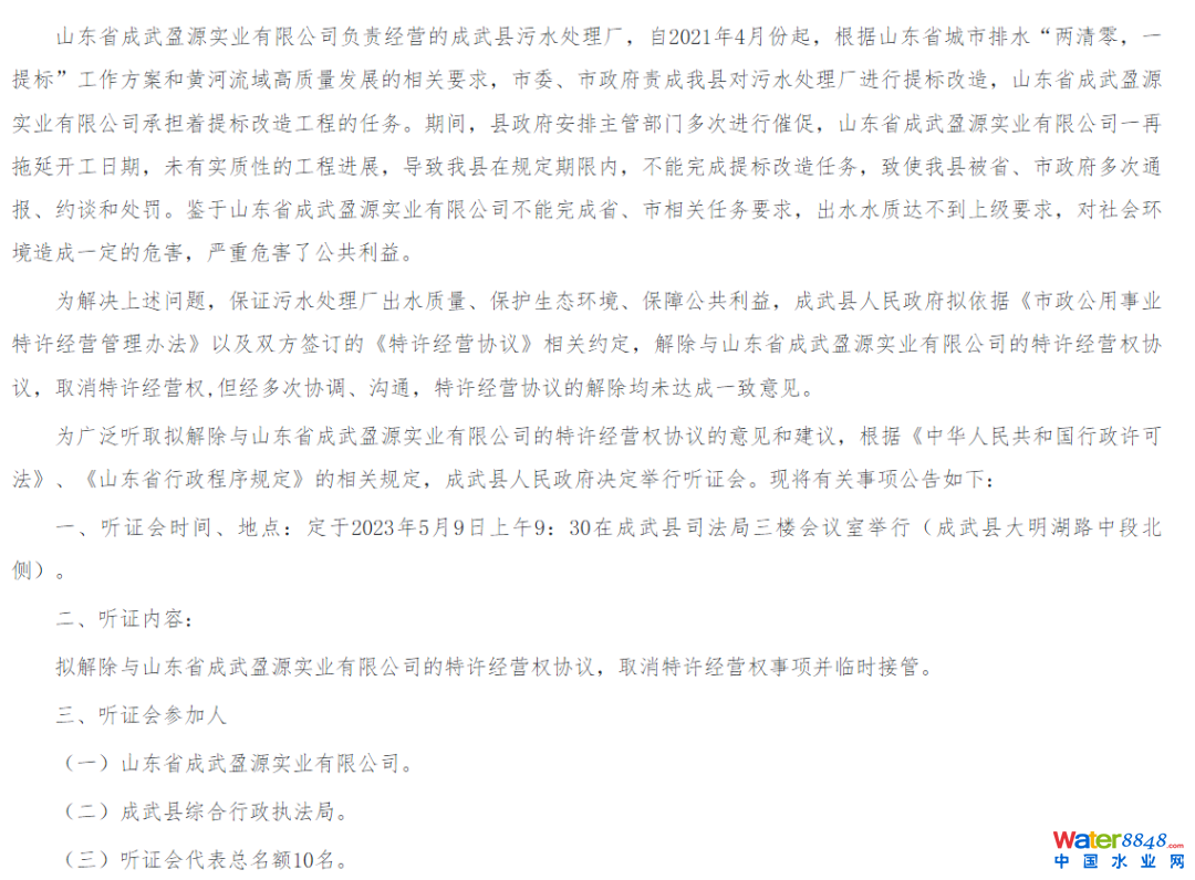 為“擬解除與山東省成武盈源實業(yè)有限公司的特許經(jīng)營權(quán)協(xié)議,取消特許經(jīng)營權(quán)事項并臨時接管”一事,成武縣人民政府決定舉行聽證會。