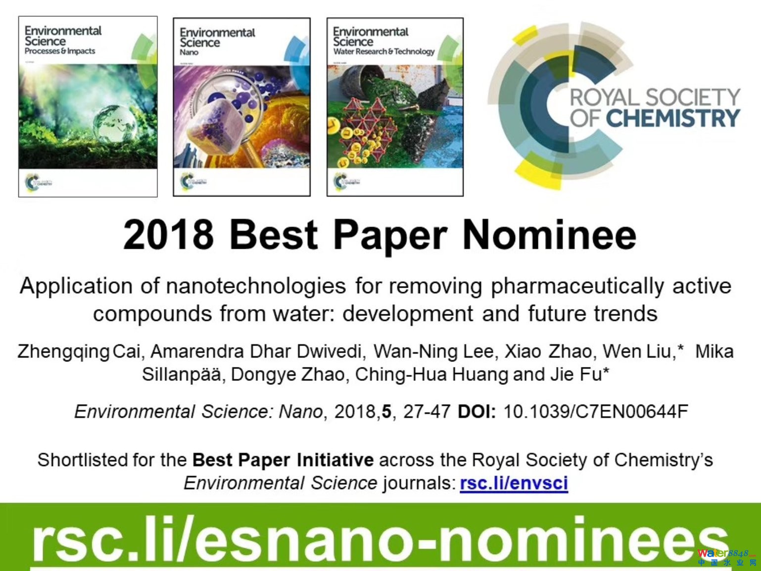 其中,2018年劉文研究員以共同通訊作者身份在Environmental Science: Nano(影響因子7.704)發(fā)表了題為“Application of nanotechnologies for removing pharmaceutically active compounds from water: development and future trends”(Cai et al., Environ. Sci. Nano, 2018, 5: 27-47)的綜述論文。該論文全面綜述了納米技術應用于水體中活性藥物去除的最新進展,各技術發(fā)展史和優(yōu)劣性,以及該領域未來的發(fā)展方向等。迄今為止,該論文被引用53次,入選ESI高被引論文(環(huán)境/生態(tài)領域前1%)。該論文同時獲得Environmental Science: Nano期刊“2018年最佳論文獎”。