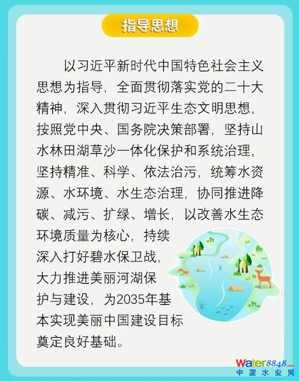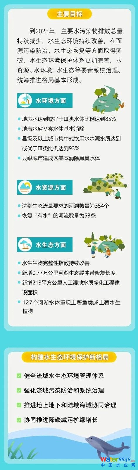 《規(guī)劃》提出到2025年,主要水污染物排放總量持續(xù)減少,水生態(tài)環(huán)境持續(xù)改善,在面源污染防治、水生態(tài)恢復等方面取得突破,水生態(tài)環(huán)境保護體系更加完善,水資源、水環(huán)境、水生態(tài)等要素系統(tǒng)治理、統(tǒng)籌推進格局基本形成。展望2035年,水生態(tài)環(huán)境根本好轉,生態(tài)系統(tǒng)實現(xiàn)良性循環(huán),美麗中國水生態(tài)環(huán)境目標基本實現(xiàn)。