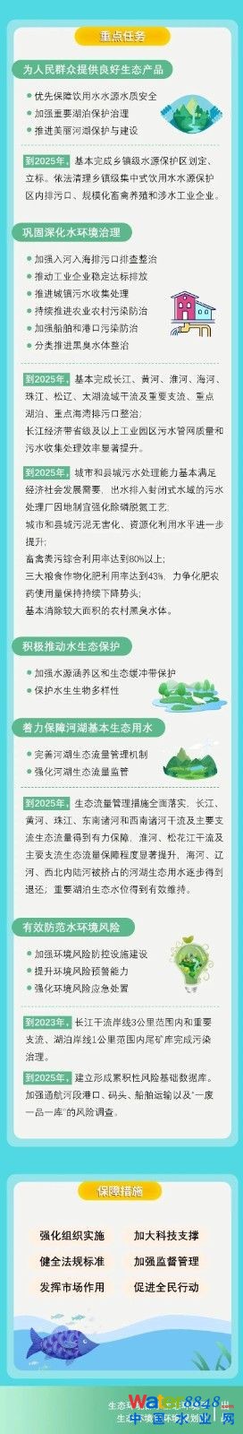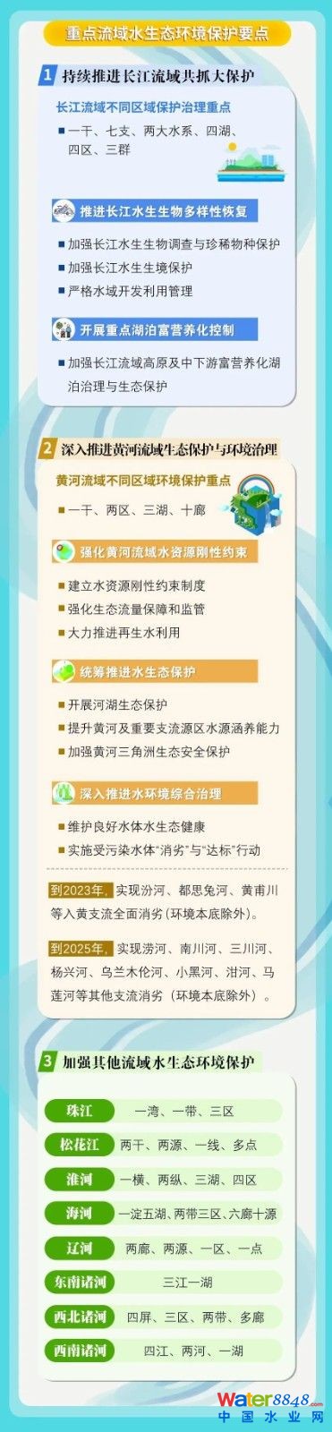 從生態(tài)環(huán)境部發(fā)布《規(guī)劃》圖示內容(下圖所示)中可以看出,重點流域治理的主要任務:到2025年,基本完成長江、黃河、淮河、海河珠江、松遼、太湖流域干流及重要支流、重點湖泊、重點海灣排污口整治)長江經(jīng)濟帶省級及以上工業(yè)園區(qū)污水管網(wǎng)質量和污水收集處理效率顯著提升;到2025年,城市和縣城污水處理能力基本滿足經(jīng)濟社會發(fā)展需要,出水排入封閉式水域的污水處理廠因地制宜強化除磷脫氮工藝城市和縣城污泥無害化、資源化利用水平進一步提升,畜禽類污綜合利用率達到80%以上三大糧食作物化肥利用率達到43%,力爭化肥農(nóng)藥使用量保持持續(xù)下降勢頭;基本消除較大面積的農(nóng)村黑臭水體。
