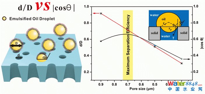 本研究中,通過濕法相轉(zhuǎn)化可控制備了系列不同孔徑大小的超親水、梯度微結(jié)構(gòu)中空纖維聚砜膜,并將其直接應(yīng)用于油水乳液體系,深入探究其微結(jié)構(gòu)與分離性能的內(nèi)在規(guī)律,以期為膜法油水分離應(yīng)用研究提供理論依據(jù)。實驗結(jié)果表明,該不對稱、超親水中空纖維梯度微濾膜由于其特殊的梯度不對稱微孔結(jié)構(gòu)能夠有效降低膜孔道被污染堵塞的幾率,具有較佳的油水分離性能。膜孔尺寸及其寸分布、微結(jié)構(gòu)等均會影響實際油水分離效果,但本質(zhì)上通過臨界擊穿壓力直接作用。最重要的是,當(dāng)油滴大小與膜孔尺寸相匹配的條件下,即所用乳化油水粒徑與所用膜孔大小的比值(0.71)與通過相應(yīng)臨界突破壓力值理論計算所得表面接觸角的余弦值(0.72),膜材料水下油接觸角的余弦值(0.65)相近時,膜對油水分離效率最佳(圖1所示)。聚合物膜孔微結(jié)構(gòu)與油滴尺寸之間的匹配內(nèi)在關(guān)系,可為膜法高效油水分離的實際應(yīng)用提供理論依據(jù)。