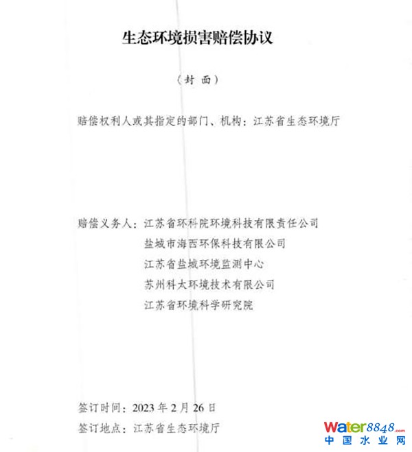 2023年2月26日,賠償權(quán)利人江蘇省生態(tài)環(huán)境廳與賠償義務(wù)人江蘇環(huán)科院環(huán)境科技有限責任公司、鹽城市海西環(huán)?萍加邢薰、江蘇省鹽城環(huán)境監(jiān)測中心、蘇州科太環(huán)境技術(shù)有限公司、江蘇省環(huán)境科學研究院簽訂生態(tài)環(huán)境損害賠償協(xié)議。