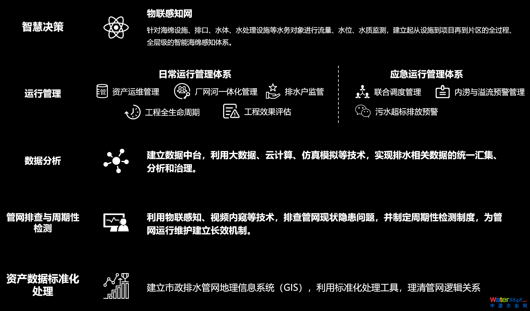 利用GIS技術(shù),對存量資產(chǎn)進(jìn)行標(biāo)準(zhǔn)化處理,經(jīng)拓?fù)錂z查后建立正確管網(wǎng)邏輯關(guān)系數(shù)據(jù)庫;然后采用物聯(lián)感知、視頻內(nèi)窺等技術(shù)進(jìn)行管網(wǎng)排查和周期性檢測,查明管網(wǎng)隱患問題,建立長效管理機(jī)制;同時(shí)構(gòu)建信息化平臺,利用大數(shù)據(jù)、云計(jì)算、仿真模擬技術(shù),對多來源、多尺度數(shù)據(jù)進(jìn)行量化分析,對工程建設(shè)效果進(jìn)行定量評估,為廠網(wǎng)河一體化運(yùn)行管理、調(diào)度決策等提供精細(xì)化、智慧化支持,為污水提質(zhì)增效提供解決方案。