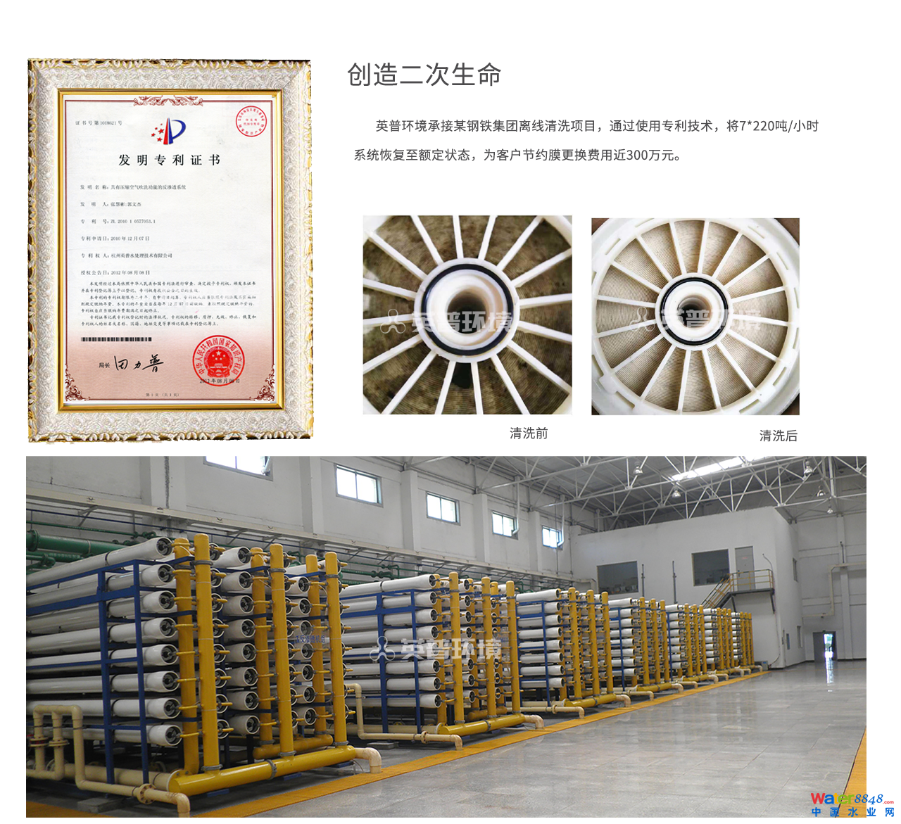 領(lǐng)先的膜再生技術(shù) 公司運(yùn)用搭載壓縮空氣分段吹洗功能(發(fā)明專(zhuān)利:ZL201010577053.1)和超聲波離線清洗裝置(專(zhuān)利號(hào):ZL201320176946.4)的膜元件再生技術(shù),能實(shí)現(xiàn)有效快速的在線/
