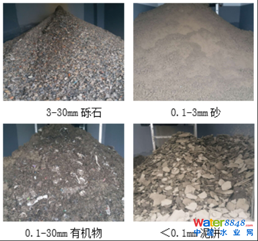 2、處理后產(chǎn)物,處理后產(chǎn)物包括垃圾、礫石、砂、有機(jī)物、泥:1.粒徑>30mm垃圾;2.粒徑3-30mm礫石;3.粒徑0.1-3mm砂;4.粒徑0.1-30mm有機(jī)物;5.粒徑<0.1mm的泥餅