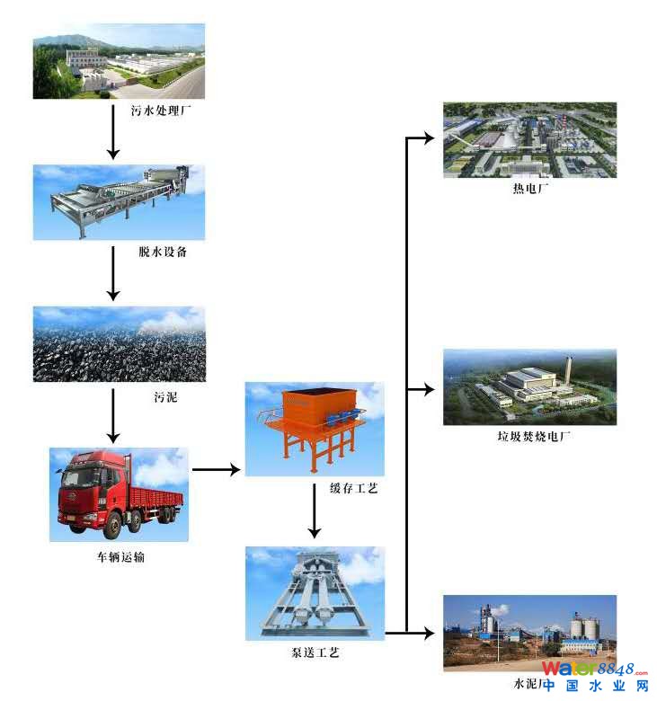 本系統(tǒng)適用于污水處理產(chǎn)生的污泥1000T/d(含水率80%),通過汽車運(yùn)輸?shù)姆绞綄裎勰嗨椭羶Υ鎮(zhèn)},經(jīng)膏體泵輸送至多層高位混料干燥機(jī)內(nèi)進(jìn)行間接式熱干燥,干燥熱源利用蒸汽,干燥后的污泥(含水率30%)作為生物質(zhì)燃料,送到熱電廠鍋爐燃燒,實(shí)現(xiàn)減量化、無害化、資源化利用。