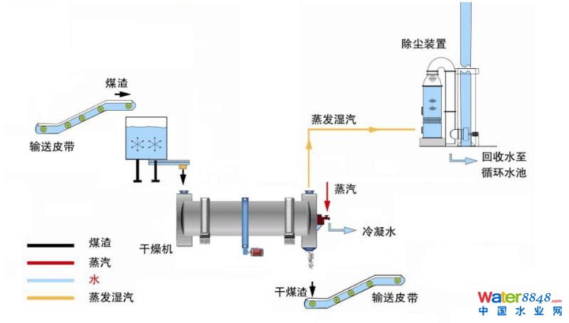 氣化細渣的處置符合穩(wěn)定化、無害化、減量化和力爭資源化的原則。本系統(tǒng)氣化細渣經(jīng)機械脫水(板框或真空帶式壓濾)后由皮帶機輸送出壓濾車間,然后轉(zhuǎn)載到干燥系統(tǒng)上料皮帶機,經(jīng)皮帶機送至干燥機前緩沖倉,倉內(nèi)設(shè)防堵機構(gòu),然后由倉下正壓螺旋給料機將氣化細渣定量送入干燥機內(nèi)。在新型臥式蒸汽間接干燥機內(nèi)部安置了蒸汽加熱管,加熱管貫穿整個干燥機,以同心圓方式排成3~5圈,干燥所需熱量由蒸汽加熱管提供,是間接連續(xù)干燥機。干燥后的氣化細渣從干燥機出料口經(jīng)皮帶機輸送裝車或裝倉。