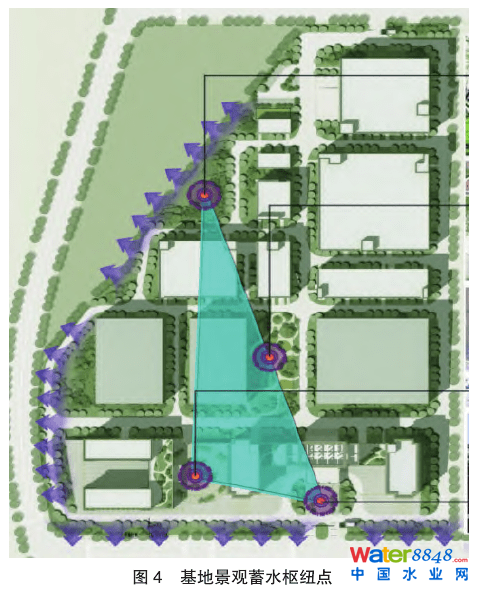 基地由于地勢(shì)高差采用臺(tái)地式布置,且道路采用放坡設(shè)計(jì),基地內(nèi)部雨水流向、雨水收集、再循環(huán),皆可實(shí)現(xiàn)由內(nèi)部原本地勢(shì)形成自然遷移;貎(nèi)部可形成三個(gè)層級(jí)的雨水徑流系統(tǒng):一是基地道路采用市政道路的標(biāo)準(zhǔn),橫坡坡度 1.5%,縱坡坡度 3%,采用豁口路沿石、線性草溝、多濾層、速滲井等措施,降低道路徑流系數(shù),儲(chǔ)存利用雨水;二是采用小型 LID 模塊化設(shè)計(jì)項(xiàng)目,由人工安裝組合幾何模塊成綠色種植容器,如屋頂綠化箱、垂直或立體綠化組合箱、地板綠化箱等。此幾何構(gòu)建內(nèi)部可承擔(dān)根系阻力、儲(chǔ)水、過(guò)濾、排水、抗風(fēng)和參與雨水收集的作用。表面;三是利用基地內(nèi)自然高差形成的洼地設(shè)計(jì)了雨水花園,效仿傳統(tǒng)農(nóng)村“澇池”的理念,雨水借地勢(shì)匯流到低洼區(qū)域,下滲到由黃砂、礫石構(gòu)成的速滲井,作為蓄水調(diào)蓄的樞紐凈化、回補(bǔ)了地下水,確保水資源的綜合循環(huán)利用(圖 4)。