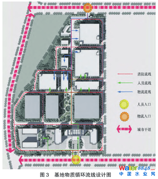 經(jīng)過(guò)深入分析中農(nóng)威特生物醫(yī)藥基地產(chǎn)業(yè)結(jié)構(gòu)特性、生產(chǎn)工藝等,在物理空間上實(shí)現(xiàn)產(chǎn)業(yè)合理布局、相互支撐的架構(gòu),塑造物質(zhì)、能量鏈供給網(wǎng)絡(luò)(圖 3)。生產(chǎn)區(qū)分布在基地北側(cè),最北側(cè)設(shè)置物流入口,且原材料及成品庫(kù)也設(shè)置在此,以便于轉(zhuǎn)運(yùn)安全便捷;動(dòng)物安檢、隔離、免疫區(qū)相對(duì)獨(dú)立且相互毗鄰,符合動(dòng)物實(shí)驗(yàn)及疫苗生產(chǎn)工藝流程;動(dòng)力站分布于基地較為居中的區(qū)域,可最大程度減少輸送能耗;廢品回收與污水處理區(qū)域于基地北物流口,實(shí)驗(yàn)動(dòng)物尸體及其它廢品統(tǒng)一回收存放廢品運(yùn)輸站,另行集中無(wú)害化處理后將其和麩皮、木屑等輔料按比例混合,可分別作為氮源和碳源,或利用微生物發(fā)酵,最終產(chǎn)物制成高檔有機(jī)肥料,形成生產(chǎn)廢料在基地內(nèi)部的產(chǎn)業(yè)閉環(huán)空間。