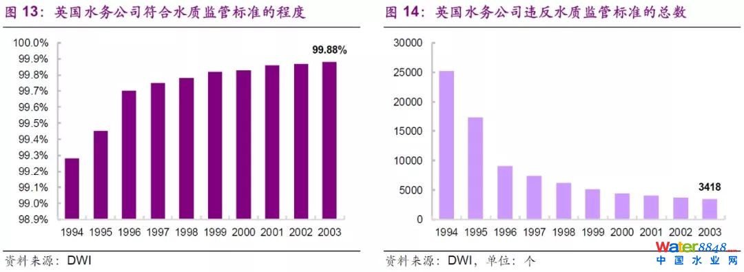 ◆1989年英國(guó)水務(wù)行業(yè)實(shí)現(xiàn)私有化,政府的支持和監(jiān)管的健全是其私有化成功的重要原因。1973年英國(guó)經(jīng)濟(jì)滯脹后,英國(guó)保守黨執(zhí)政并主張通過(guò)減少?lài)?guó)家干預(yù)、發(fā)揮市場(chǎng)機(jī)制的方法來(lái)重新啟動(dòng)經(jīng)濟(jì)發(fā)展(從凱恩斯主義到自由市場(chǎng)經(jīng)濟(jì)的轉(zhuǎn)變),這也開(kāi)啟了英國(guó)歷史上規(guī)模最大,范圍最廣的私有化運(yùn)動(dòng),而英國(guó)水務(wù)私有化正是在全英私有化運(yùn)動(dòng)的大背景下進(jìn)行的。水務(wù)行業(yè)私有化后,投資及資本開(kāi)支的力度顯著增加(年均投資從15.5億英鎊到30億英鎊,近乎翻倍)、河流及應(yīng)用水水質(zhì)明顯改善(英國(guó)的水務(wù)公司在2003年符合飲用水標(biāo)準(zhǔn)的比率達(dá)到99.88%)、水廠運(yùn)營(yíng)成本得到有效控制,行業(yè)發(fā)展進(jìn)入新的階段。