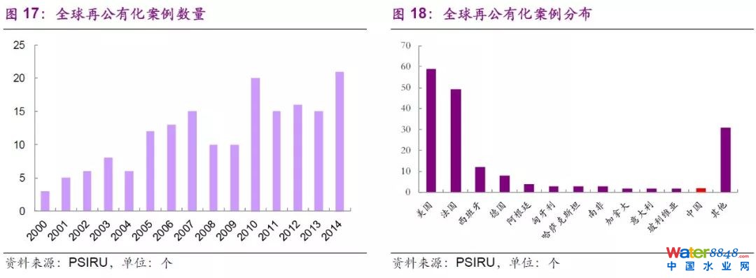 水務(wù)行業(yè)的再公有化趨勢(shì)是一個(gè)全球范圍的趨勢(shì)。2000年到2014年間,全球出現(xiàn)了約180個(gè)再公有化案例,其中在法國(guó)、美國(guó)等水務(wù)行業(yè)市場(chǎng)化程度較高的國(guó)家發(fā)生的情況最甚。但是,再公有化的趨勢(shì)尚未波及到英國(guó)。