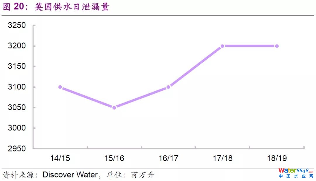 二是私營(yíng)水務(wù)公司重利潤(rùn)輕運(yùn)營(yíng)使得水務(wù)運(yùn)營(yíng)質(zhì)量下降。英國(guó)水務(wù)行業(yè)的監(jiān)管是基于價(jià)格限制,而不是對(duì)利潤(rùn)或回報(bào)率的控制;在收入端控制的情況下,企業(yè)為了獲得高額利潤(rùn)會(huì)盡可能地降低成本;而降成本導(dǎo)致的直接問(wèn)題是英國(guó)的供水漏損問(wèn)題嚴(yán)重,而企業(yè)疏于治理。自2010年以來(lái),所有水務(wù)公司的股東派息已達(dá)135億英鎊以上,幾乎與這些公司的稅前利潤(rùn)相當(dāng),但它們卻始終沒(méi)有堵住全國(guó)高達(dá)30億升的供水漏損,這背后的核心原因是私人水務(wù)公司已經(jīng)基本壟斷了英國(guó)水務(wù)行業(yè),其并沒(méi)有動(dòng)力改善服務(wù);且相比治理漏損,引入更多的水資源花費(fèi)的成本相對(duì)更低,因此水務(wù)公司在經(jīng)濟(jì)層面也沒(méi)有改善漏損的意愿。
