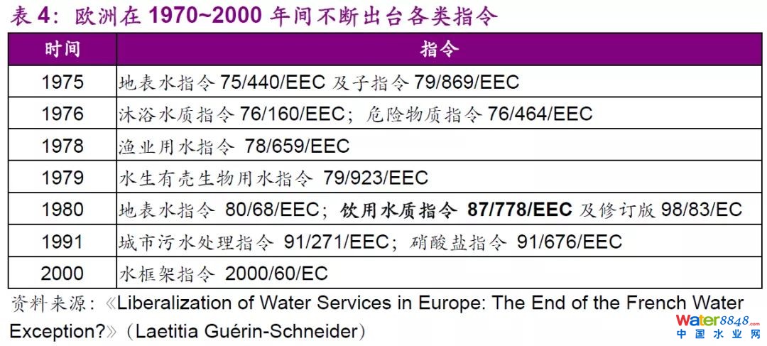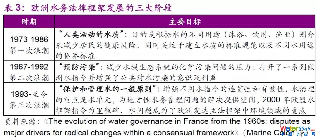 此外,歐洲一系列框架協(xié)議對(duì)水質(zhì)要求的日趨嚴(yán)格也直接加重了地方政府的運(yùn)營(yíng)壓力。1970s歐洲陸續(xù)出臺(tái)了一系列關(guān)于水質(zhì)和污水處理的框架協(xié)議,其發(fā)展可以總結(jié)為三個(gè)階段浪潮,并側(cè)重不同方面。歐洲框架法規(guī)的變革以及其對(duì)水質(zhì)標(biāo)準(zhǔn)的高要求持續(xù)推動(dòng)歐洲水務(wù)行業(yè)的市場(chǎng)化進(jìn)程(也在后期促成了法國(guó)和意大利水務(wù)市場(chǎng)的部分私營(yíng)化以及英國(guó)地區(qū)的全部私營(yíng)化)。
