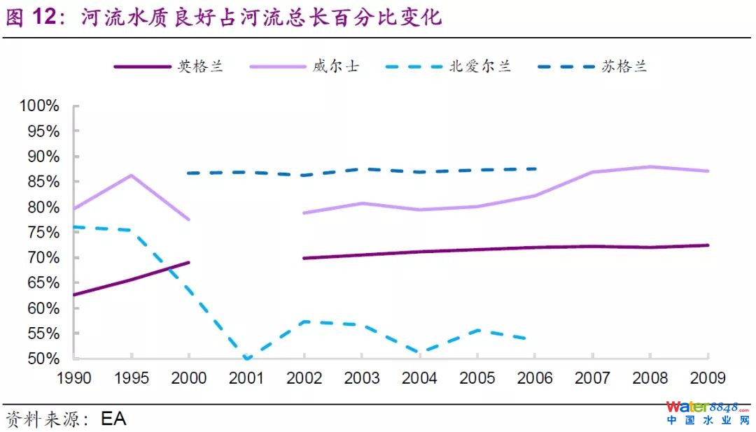 二是河流水質(zhì)的明顯提升。在資本的持續(xù)推動(dòng)下,1990-2009年期間,英格蘭和威爾士地區(qū)的河流生物水質(zhì)均有明顯提升,而未實(shí)現(xiàn)水務(wù)私有化的北愛(ài)爾蘭和蘇格蘭地區(qū),河流生物水質(zhì)下降或基本不變。