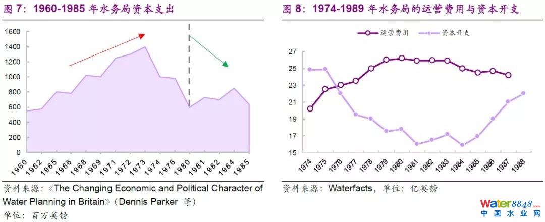 持續(xù)資本開(kāi)支方面,水務(wù)運(yùn)營(yíng)資產(chǎn)的設(shè)備老化需要更新和置換,其引發(fā)的容量不足、滲漏等問(wèn)題都需要通過(guò)投資解決。上世紀(jì)70年代末和80年代初適逢英國(guó)滯漲,在此背景下政府并不愿意讓水務(wù)部門(mén)增加借款或向客戶增加收費(fèi)以滿足其資本開(kāi)支要求;因此保守黨政府自1979年以后逐步削減公共開(kāi)支,水務(wù)局的開(kāi)支和投資也被大幅削減,水務(wù)局的實(shí)際借款數(shù)額亦顯著減少;資金的缺乏使得資本投資方案的高需求無(wú)法被滿足,這種情況在1980年后達(dá)到巔峰,政府允許水務(wù)行業(yè)使用的資本投資額僅占1974的一半左右。