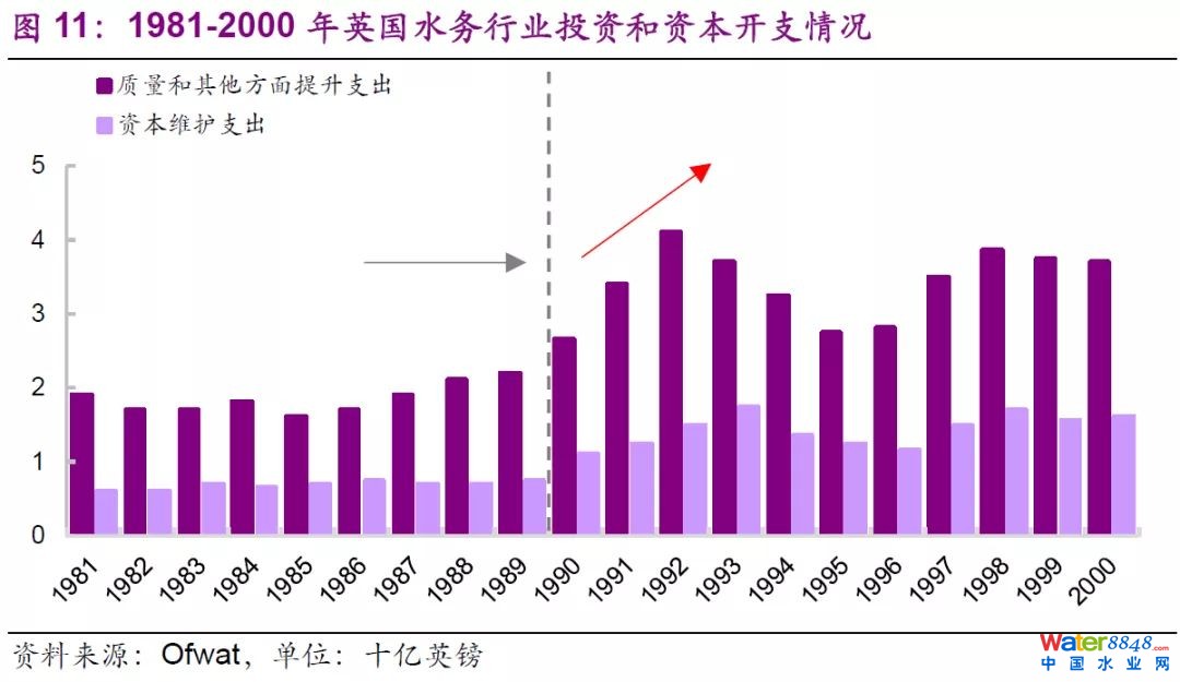 (2)英國(guó)水務(wù)行業(yè)私有化是英國(guó)私有化運(yùn)動(dòng)浪潮下的必然結(jié)果,對(duì)行業(yè)發(fā)展起到了正面推動(dòng)作用。1973年英國(guó)經(jīng)濟(jì)滯脹后,英國(guó)保守黨執(zhí)政并主張通過(guò)減少?lài)?guó)家干預(yù)、發(fā)揮市場(chǎng)機(jī)制的方法來(lái)重新啟動(dòng)經(jīng)濟(jì)發(fā)展,這也開(kāi)啟了英國(guó)歷史上規(guī)模最大、范圍最廣的私有化運(yùn)動(dòng),而英國(guó)水務(wù)私有化正是在私有化運(yùn)動(dòng)的大背景下進(jìn)行的。水務(wù)行業(yè)私有化后,投資及資本開(kāi)支的力度顯著增加、河流及應(yīng)用水水質(zhì)明顯改善、水廠運(yùn)營(yíng)成本得到有效控制,行業(yè)重回快速發(fā)展軌道。