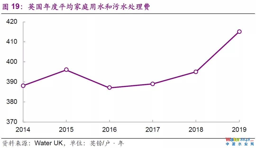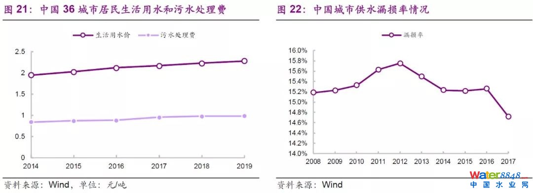 當(dāng)前,中國(guó)水務(wù)行業(yè)的私有化和市場(chǎng)化過(guò)程也在進(jìn)行中。對(duì)于中國(guó)是否會(huì)在不久的將來(lái)也會(huì)出現(xiàn)再公有化的問(wèn)題,我們認(rèn)為可能性較低,原因有以下兩點(diǎn):(1)與英國(guó)的情況不同,中國(guó)政府對(duì)于水價(jià)的監(jiān)管力度更強(qiáng),多年來(lái)水價(jià)平穩(wěn),并沒(méi)有大幅上漲;(2)在政府的嚴(yán)格把控和多方位的技術(shù)支持下,國(guó)內(nèi)漏損率多年來(lái)維持在15%左右,且近年有下降趨勢(shì),而英國(guó)近年的漏損率為20%左右。綜上,我們認(rèn)為中國(guó)水務(wù)行業(yè)未來(lái)有能力繼續(xù)擴(kuò)大市場(chǎng)化程度,且隨著近年來(lái)外資企業(yè)在華業(yè)務(wù)進(jìn)入收縮階段,中國(guó)國(guó)有和民營(yíng)水務(wù)公司仍有較大的發(fā)展空間。