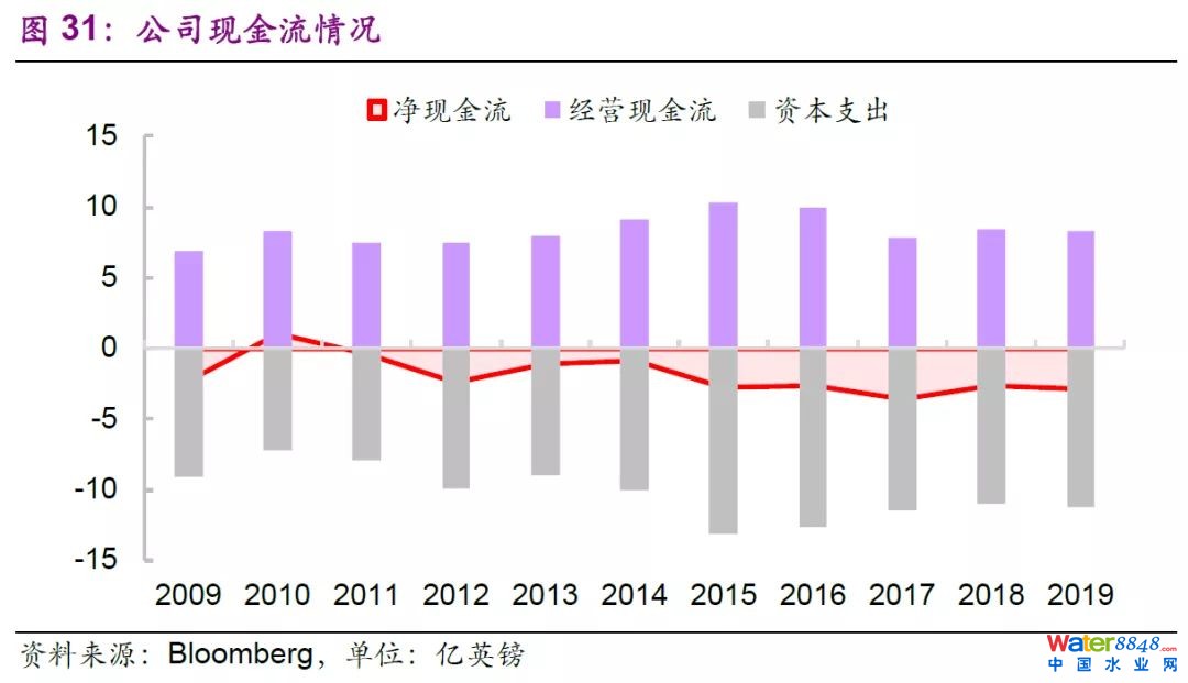 公司業(yè)務(wù)布局情況穩(wěn)定,近年來(lái)公司資本開(kāi)支穩(wěn)定提升(2004-2018年投資額超過(guò)150億英鎊),2019年公司總共投資了11.89億英鎊用于Lee隧道、泰晤士河Tideway隧道等供排水基礎(chǔ)設(shè)施建設(shè),以及智能水表等設(shè)備改善;近年來(lái)公司經(jīng)營(yíng)現(xiàn)金流較資本開(kāi)支相比仍有一定缺口,需持續(xù)提升外部融資力度和經(jīng)營(yíng)效率以滿足公司投資擴(kuò)張的需求。