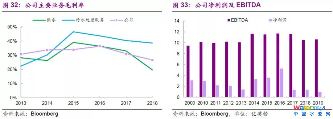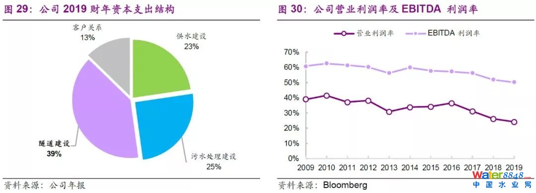 公司2018/19年度供水量27億升/日,每日水循環(huán)中心處理污水44億升,實(shí)現(xiàn)營(yíng)業(yè)收入21億英鎊,EBIT和EBITDA分別為1.3和10.6億英鎊,監(jiān)管資產(chǎn)價(jià)值達(dá)137億英鎊。公司近年來(lái)營(yíng)業(yè)收入穩(wěn)定,同時(shí)保持對(duì)基礎(chǔ)設(shè)施建設(shè)的投資力度,供排水系統(tǒng)不斷完善,目前公司主要投資的泰晤士河Tideway隧道(未來(lái)將成為英國(guó)規(guī)模最大的污水治理工程),建成運(yùn)營(yíng)后可收集倫敦泰晤士河97%的污水,并可以連接已建成的Lee隧道;該項(xiàng)目的建成投運(yùn)將有助于進(jìn)一步提升公司污水治理效率和規(guī)模,促進(jìn)水質(zhì)量和水環(huán)境的持續(xù)改善。