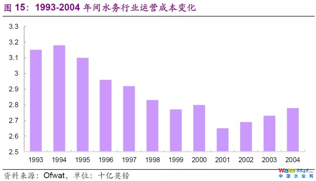 三是運(yùn)營(yíng)成本得到有效控制。十家水務(wù)局自然壟斷的局面為英國(guó)水務(wù)行業(yè)帶來(lái)了一定程度的規(guī)模效應(yīng),水務(wù)行業(yè)整體的運(yùn)營(yíng)成本在私有化后呈現(xiàn)下降趨勢(shì),并在2001年到達(dá)1993-2004年間的最低點(diǎn)。