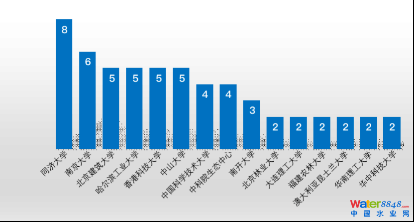 本特刊開(kāi)放投稿系統(tǒng)后,共收到260篇稿件,經(jīng)全球?qū)徃遄罱K共收錄發(fā)表了76篇高質(zhì)量論文。據(jù)統(tǒng)計(jì),接收的文章共來(lái)自34家研究主體(基于第一單位統(tǒng)計(jì)),其中,收錄在2篇以上的同一研究主體分布如下圖所示,同濟(jì)大學(xué)貢獻(xiàn)8篇,可見(jiàn)其在水研究領(lǐng)域的活躍;南京大學(xué)以6篇位居其次, 北京建筑大學(xué)、哈爾濱工業(yè)大學(xué)、香港科技大學(xué)和中山大學(xué)并列第三位,分別貢獻(xiàn)5篇。其中,84%的收錄文章得到了國(guó)家自然科學(xué)基金委的資助。從文章主題分類來(lái)看,分享污水/污泥處理成果的文章共計(jì)46篇,為本特刊研究的熱點(diǎn)主題;其余主題關(guān)注熱度依次為能源/資源回收(11篇)、飲用水安全保障(11篇)、管道系統(tǒng)管理與維護(hù)(4篇)、黑臭水體治理(3篇)以及海綿城市建設(shè)(1篇)。