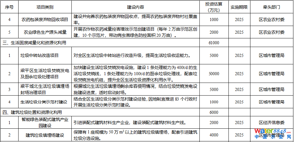 重點建設階段(2021-2023年):梁平區(qū)綠色低碳高質量發(fā)展水平進一步提升,全區(qū)綠色生活方式和消費模式廣泛推行,基本建成固體廢物管理體制機制,固體廢物突出環(huán)境問題得到有效解決,固體廢物減量化、資源化、無害化水平全面提升。