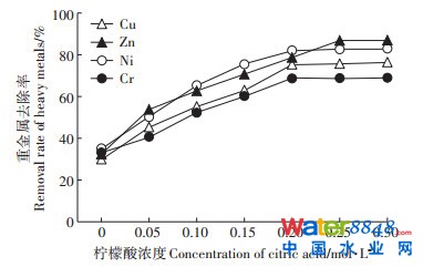 圖 8 檸檬酸濃度對剩余污泥中重金屬去除率的影響Figure 8 Effect of citric acid concentration on the removal rate of heavy metals in residual sludge |