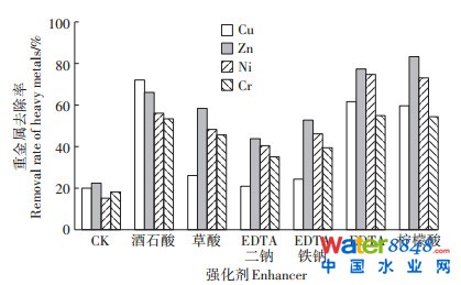 圖 4 強(qiáng)化劑對剩余污泥中重金屬去除率的影響Figure 4 Effect of enhancer on the removal rate of heavy metals in residual sludge |