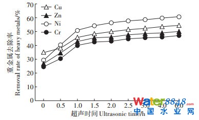 圖 6 超聲時間對剩余污泥中重金屬去除率的影響Figure 6 Effect of ultrasonic time on the removal rate of heavy metals in residual sludge |