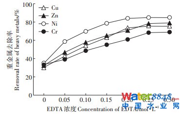 圖 7 EDTA濃度對剩余污泥中重金屬去除率的影響Figure 7 Effect of EDTA concentration on the removal rate of heavy metals in residual sludge |