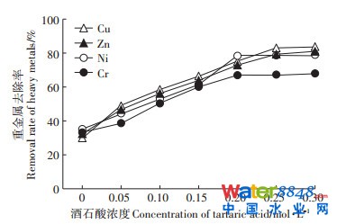圖 9 酒石酸濃度對剩余污泥中重金屬去除率的影響Figure 9 Effect of tartaric acid concentration on the removal rate of heavy metals in residual sludge |