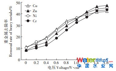 (4)隨著電壓的增大,電動技術(shù)對剩余污泥中重金屬的去除率逐漸提高,最適電壓為1.5 V·cm-1。