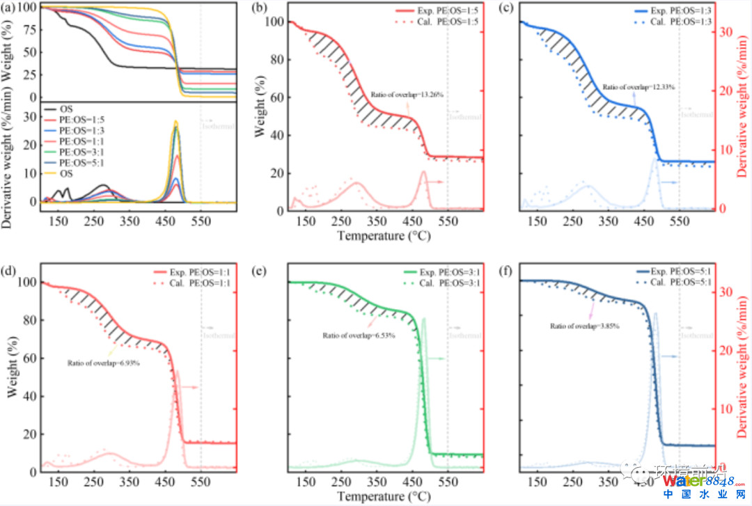 圖2 (a)油泥、聚乙烯塑料及其混合物的熱重曲線;(b)–(f)混合物熱重曲線的實驗值和計算值的對比 (圖中OS為油泥,PE為聚乙烯塑料)