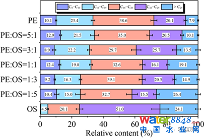 圖3 油泥、聚乙烯塑料及其混合物熱解產(chǎn)油成分 (圖中OS為油泥,PE為聚乙烯塑料)