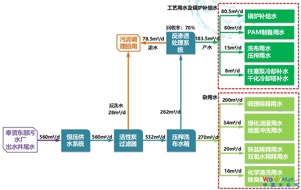 奉賢區(qū)東部污水處理廠尾水處理達(dá)標(biāo)后,用于東部污泥廠廠區(qū)生產(chǎn)生活雜用水、工藝用水、鍋爐補(bǔ)給水等用途。其中,雜用水滿足《城市污水再生利用城市雜用水水質(zhì)》(gb/t 18920-2020)的標(biāo)準(zhǔn)要求,主要用于:稀釋用水、化學(xué)清洗用水、除臭循環(huán)補(bǔ)水、地面沖洗用水、沖廁用水等;工藝用水滿足《城市污水再生利用工業(yè)用水水質(zhì)》(gb/t 19923-2005)的標(biāo)準(zhǔn)要求,主要用于:pam制備用水、柱塞泵冷補(bǔ)水、洗布用水、壓榨補(bǔ)水、干化冷卻水塔補(bǔ)水等;鍋爐補(bǔ)給水滿足《工業(yè)鍋爐水質(zhì)》(gb/t 1576-2018)的標(biāo)準(zhǔn)要求。