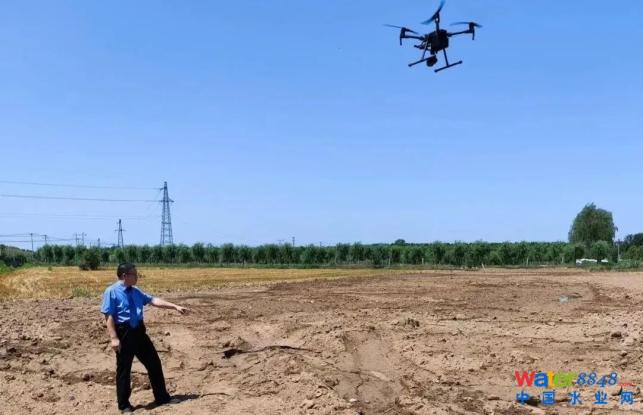 檢察干警在污染源附近用無(wú)人機(jī)固定證據(jù)。