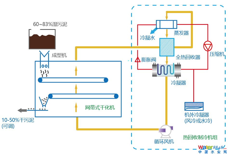 節(jié)能熱泵低溫干化機(jī)是網(wǎng)帶式干燥機(jī)和熱回收制冷機(jī)組的有機(jī)結(jié)合。網(wǎng)帶式干化機(jī)采用低溫?zé)峥諝鉃楦稍锝橘|(zhì),對污泥進(jìn)行對流干燥。熱回收制冷機(jī)組采用空氣源熱泵原理對污泥干燥產(chǎn)生的濕熱空氣進(jìn)行熱回收-熱泵除濕-加熱升溫,使熱空氣和熱能循環(huán)利用,節(jié)能效果顯著。 污泥低溫干化機(jī)只需要消耗少量電能就可以將80%含水率的污泥直接干化至10-40%,減量達(dá)80%。干化后的污泥性質(zhì)穩(wěn)定、熱值提高,可以進(jìn)行摻燒、填埋、建材利用、熱解氣化等。