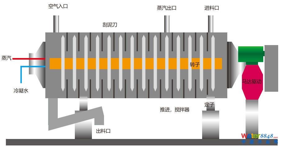 污泥圓盤式干化機(jī)是一種污泥間接加熱干化設(shè)備,主要是由定子(外殼),轉(zhuǎn)子(圓盤)、驅(qū)動(dòng)裝置(減速機(jī))組成。污泥在外殼和空心軸之間流動(dòng),圓盤組是中空的,熱蒸汽從內(nèi)部流過。通過筒體夾套、空心軸和空心盤片把熱