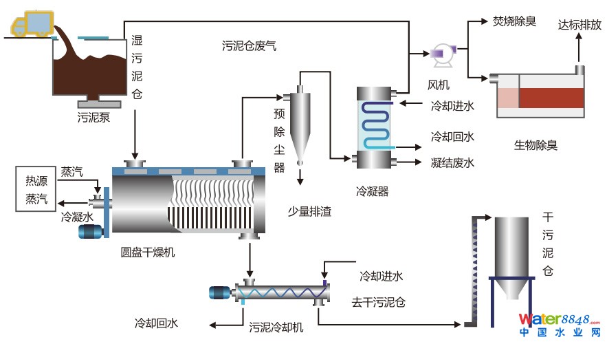干化尾氣采用自惰式密閉循環(huán)利用技術(shù),回收尾氣中的部分熱能,用于加熱干化載氣。尾氣冷卻可采用電廠缸套冷卻水或用于除鹽水加熱,減少低加和除氧器加熱抽氣消耗,提高電廠能源綜合利用率。
