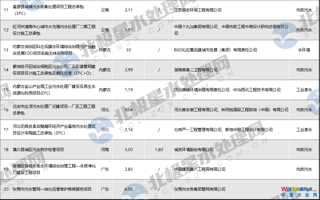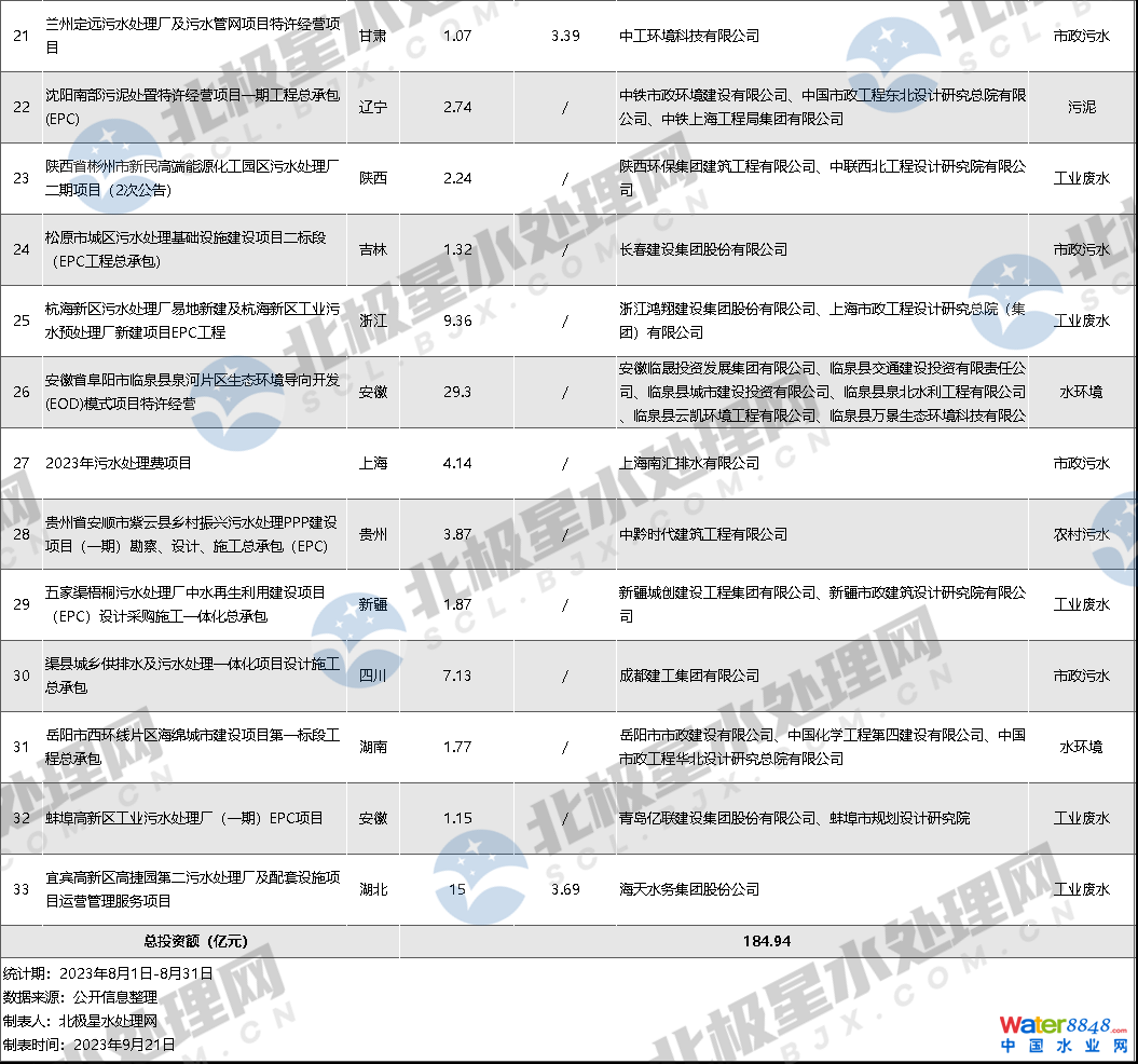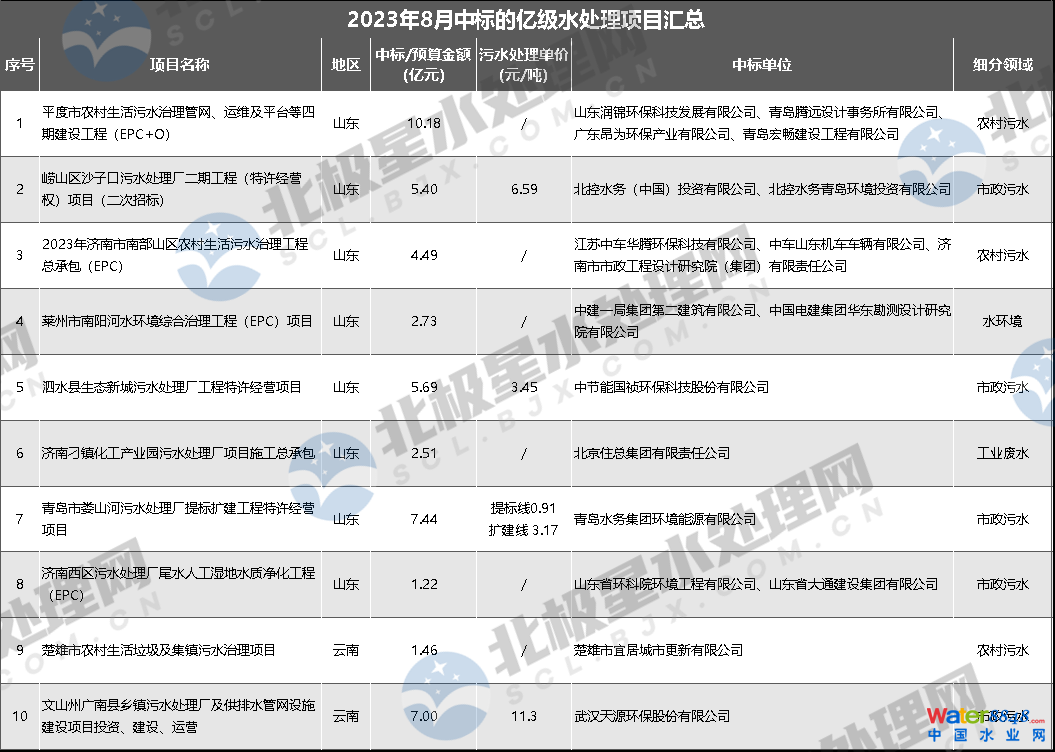 2023年8月中標(biāo)的億級水處理項(xiàng)目清單如下: